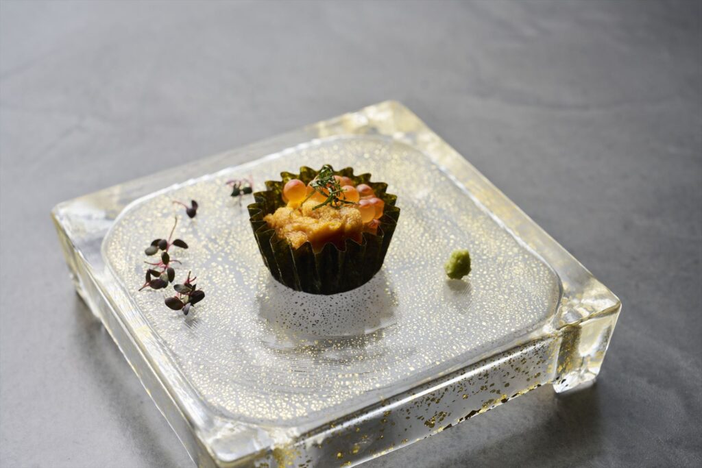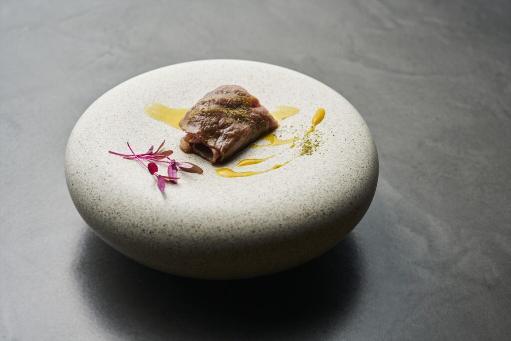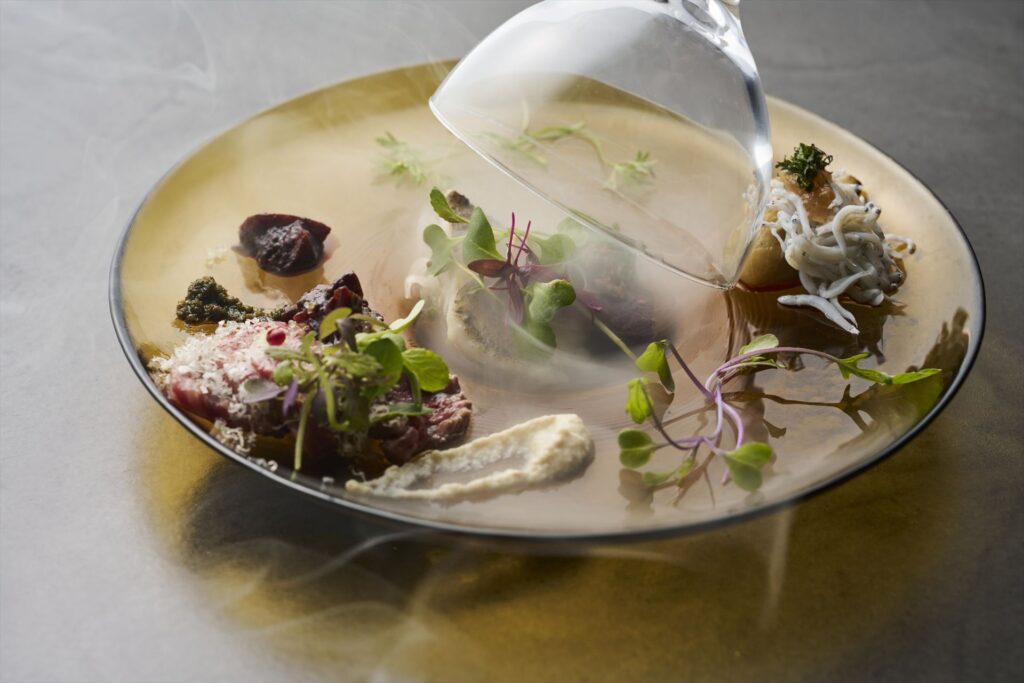 - 黒潮魚介の燻製焼きと熊野牛赤身の焼きカルパッチョ
